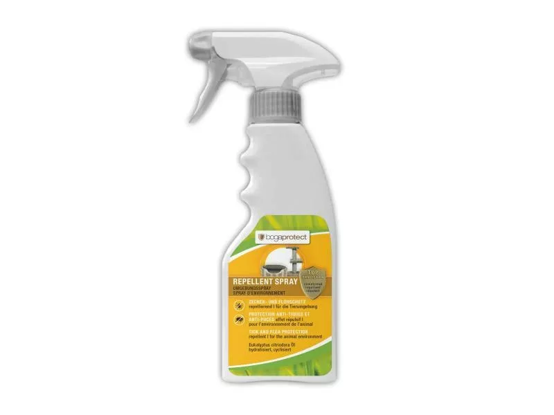 Bogaprotect Repellent Spray ist ein hochwirksamer, abwehrender Zecken- und Flohschutz mit Sofortwirkung. Das Produkt basiert auf dem Wirkstoff Eukalyptus citriodora (hydratisiert, cyclisiert); dieser wird aus Blättern des Lemonen-Eukalyptus gewonnen und gilt als wirksamster Insektenschutz natürlicher Herkunft. Zecken und Flöhe werden dadurch abgewehrt, aber nicht getötet; eine Resistenzbildung ist unmöglich.