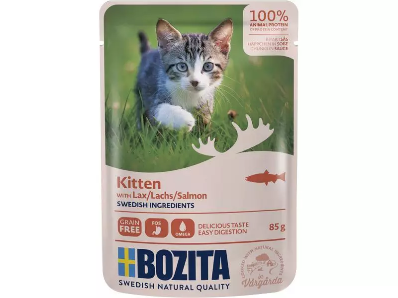 Bozita Kitten Lachs ist ein Alleinfuttermittel für Kitten und junge Katzen mit feineren Häppchen. Das Futter deckt den hohen Energie- und Proteinbedarf der jungen Katze und bietet optimale Bedingungen für Wachstum und Muskelaufbau. Lachs enthält gesunde Fettsäuren, die unter anderem für die Entwicklung der Gehirnfunktion und des Sehvermögens der Kitten wichtig sind. Präbiotisches FOS fördert eine gesunde Darmflora. Das Produkt enthält ein optimales Gleichgewicht an Mineralstoffen (Ca, P, Mg) und einen hohen Anteil an Vitaminen und Taurin. Alle Zutaten werden sorgfältig aus der schwedischen Wildnis und von schwedischen Bauern ausgewählt.
