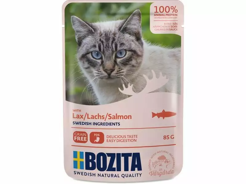 | Zusammensetzung | Fleisch und tierische Nebenerzeugnisse* 42%, Lachs* (8%), Mineralstoffe, Zichorieninulin (FOS 0.1%). *Schwedische natürliche Zutaten |
