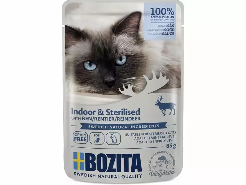 Bozita Indoor & Sterilised Rentier ist ein ausgewogenes Alleinfuttermittel für die erwachsene Katze. Das Futter ist auf den etwas geringeren Energiebedarf von Wohnungs- und sterilisierten Katzen abgestimmt und somit auch für ältere und übergewichtige Katzen geeignet. Es enthält L-Carnitin, das ein wesentlicher Bestandteil des Stoffwechsels der Katze ist. Schwedisches Rentier macht das Futter besonders schmackhaft und leicht verdaulich, sodass die Katze die Nährstoffe leichter aufnehmen kann. Cellulosefasern reduzieren das Risiko von Haarballen. Zur Unterstützung einer gesunden Darmflora enthält das Produkt präbiotisches FOS. Das Produkt enthält ausserdem einen ausgewogenen und auf sterilisierte Katzen abgestimmten Mineralstoffgehalt (Ca, P, Mg) sowie einen hohen Anteil an Vitaminen und Taurin.