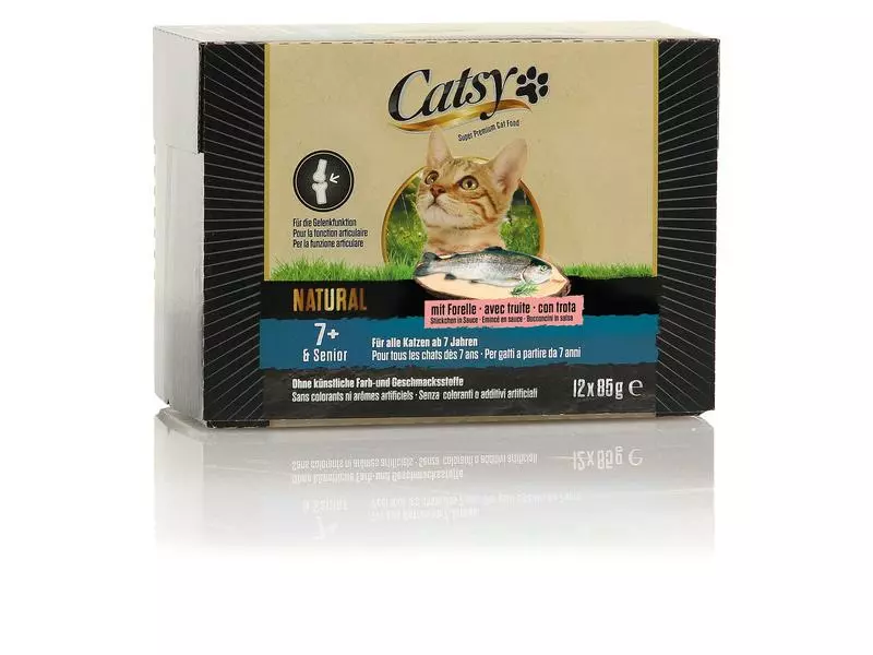 Mit 7 Jahren treten bei Katzen erste physiologische Veränderungen auf. Dank funktionalen Inhaltstoffen unterstützt Catsy Ihre Katze bei diesem Prozess. Im Futter enthalten ist Frischfleisch mit natürlich vorkommenden Vitaminen, hoch verdaulichen Proteinen und einem sehr guten Geschmack. Das Futter unterstützt die natürlichen Abwehrkräfte und danke der zusätzlichen Ergänzung mit Vitamin E wirkt es sich positiv auf die Bekämpfung der Zellalterung aus. Fisch- und Sonnenblumenöle sind reich an essentiellen Fettsäuren Omega 3 und 6 und fördern eine gesunde Haut und Haare, durch den optimalen PH-Wert im Urin wird das Risiko von Harnsteinbildung reduziert und Chondroitin und Glucosamin unterstützen die Gesundheit der Gelenke. Das Futter enthält keine künstliche Farb- und Geschmacksstoffe.