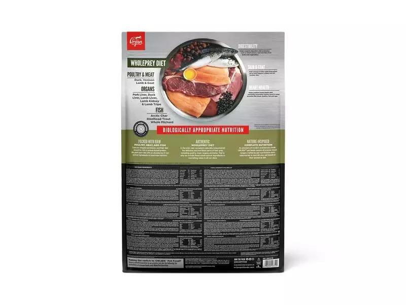 | Zusammensetzung | Frisches Ziegenfleisch (5%), frisches Wildschweinfleisch (5%), frisches Hirschfleisch (5%), frischer Arktischer Saibling (5%), frisches Entenfleisch (5%), frisches Hammelfleisch (4%), frische Regenbogenforelle (4%), frische Entenleber (4%), frische Wildschweinleber (4%), frische Wildschweinnieren (4%), ganze Makrele (getrocknet, 4%), frische ganze Sardinen (4%), Lamm (getrocknet, 4%), Hammel (getrocknet, 4%), Alaska-Kabeljau (getrocknet, 4%), ganzer Blauer Wittling (getrocknet, 4%), Entenfett (4%), ganzer Hering (getrocknet, 4%), ganze rote Linsen, ganze grüne Linsen, ganze grüne Erbsen, ganze Kichererbsen, ganze gelbe Erbsen, ganze Wachtelbohnen, Linsenfasern, frischer Schafpansen (1,5%), Heringsöl (1%), frische Ziegenherzen (1%), frische Ziegennieren (1%), frische Ziegenleber (0,5%), frische Hirschherzen (0,5%), frische Hirschleber (0,5%), frische Hammelleber (0,5%), frische Wildschweinherzen (0,5%), ganze grüne Bohnen, gefriergetrocknete Ziegenleber, gefriergetrocknete Hirschleber, frischer Gartenkürbis, frischer Butternusskürbis, frische ganze Zucchini, frische ganze Pastinaken, frische Möhren, frische ganze Äpfel, frische ganze Birnen, frischer Gemüsekohl, frischer Jungspinat, frische Rübenblätter, frischer Rübstiel, brauner Seetang, ganze Cranberries, ganze Heidelbeeren, Chicoréewurzeln, Kurkuma, Sarsaparillawurzeln, Eibischwurzeln, Hagebutten, Wacholderbeeren. |